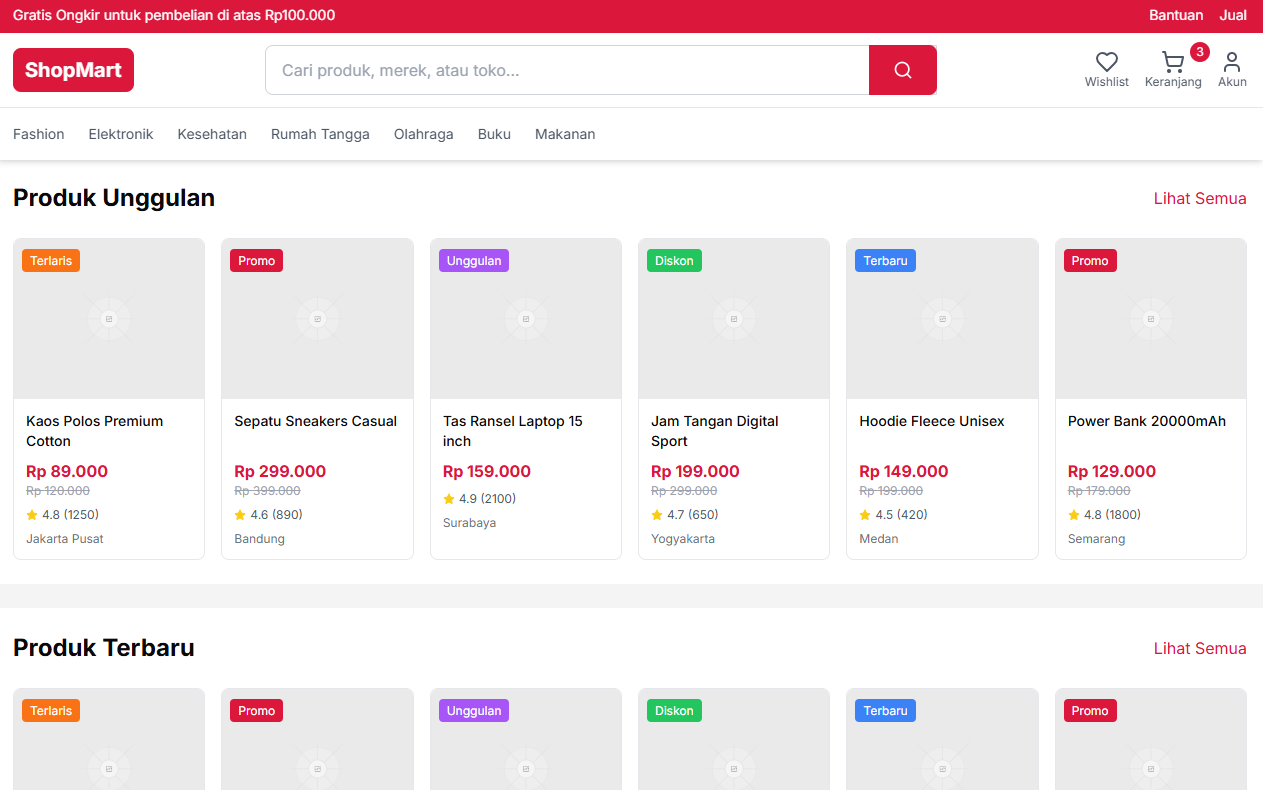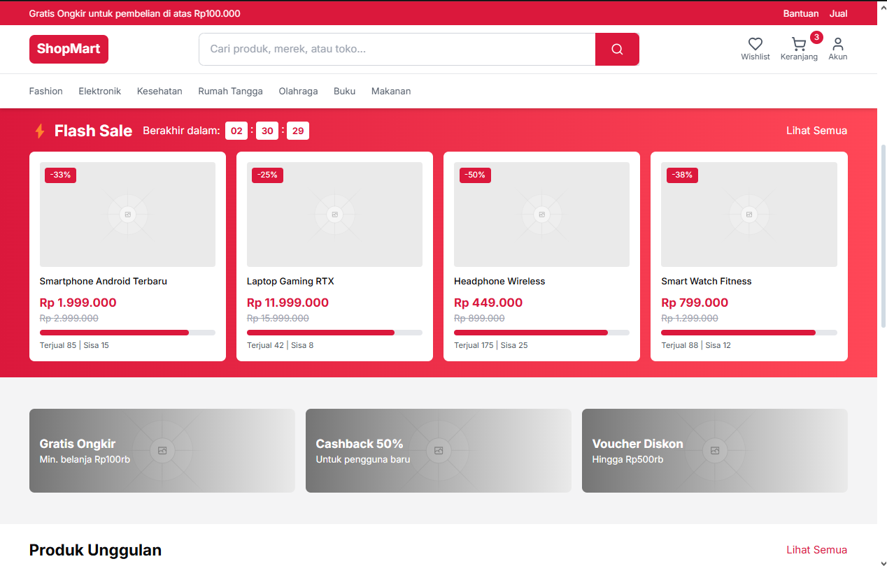Platform e-commerce modern yang dibangun dengan teknologi terdepan untuk memberikan pengalaman berbelanja online yang optimal. Dilengkapi dengan sistem pembayaran yang aman, manajemen inventory real-time, dan analytics dashboard untuk memantau performa bisnis.