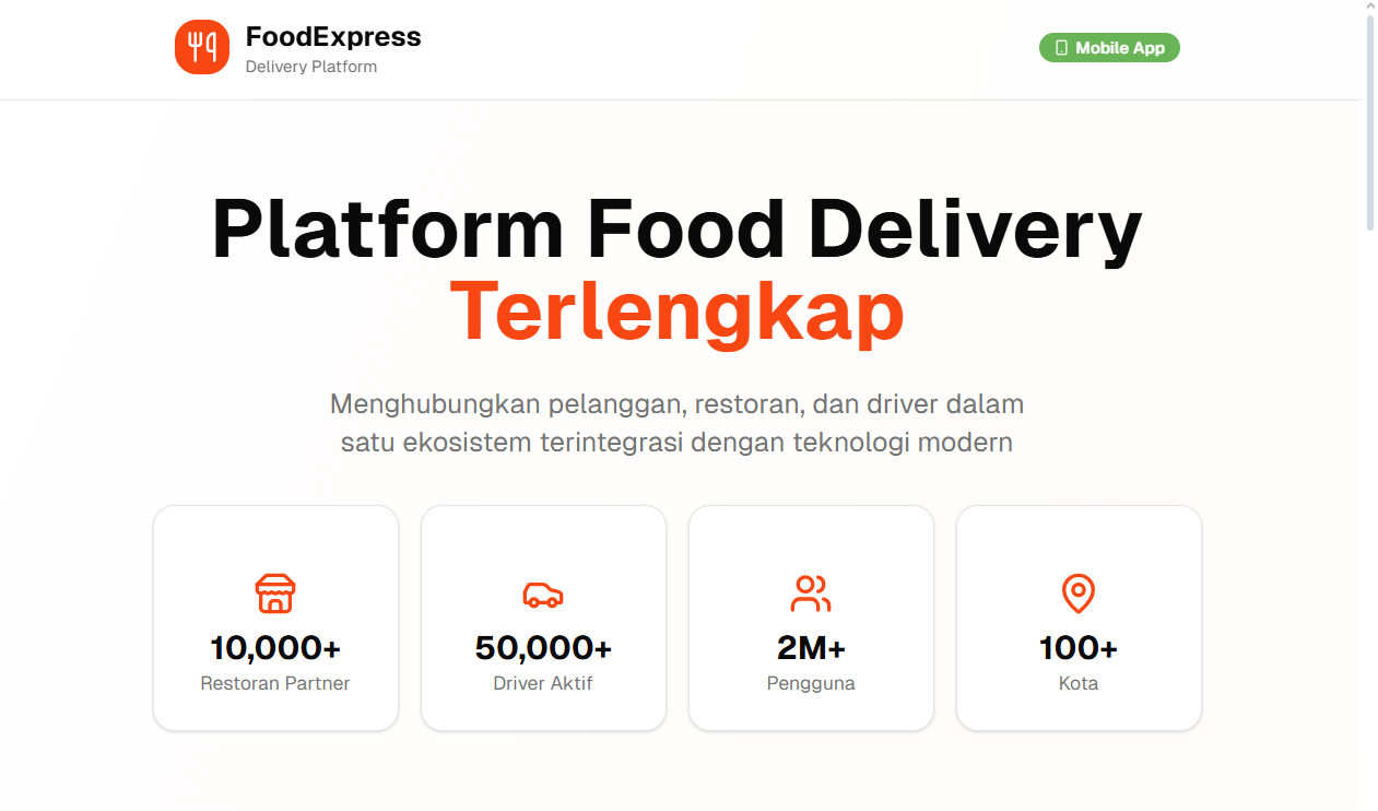 Aplikasi mobile untuk layanan delivery makanan yang menghubungkan restoran, driver, dan pelanggan dalam satu platform yang terintegrasi. Dilengkapi dengan GPS tracking, notifikasi real-time, dan sistem rating.