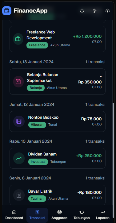 Personal Finance App dirancang untuk membantu pengguna mengelola keuangan harian, bulanan, maupun jangka panjang. Aplikasi ini menyediakan fitur pencatatan transaksi otomatis/manual, pembuatan anggaran, pelacakan pengeluaran, laporan visual, hingga pengingat tagihan. Dilengkapi analisis keuangan dan rekomendasi cerdas untuk membantu pengguna mencapai tujuan finansial dengan lebih mudah,tanpa stres, dan tanpa kebingungan. 💸 Atur keuanganmu sekarang — jangan tunggu sampai terlambat. Dapatkan akun untuk akses semua fitur