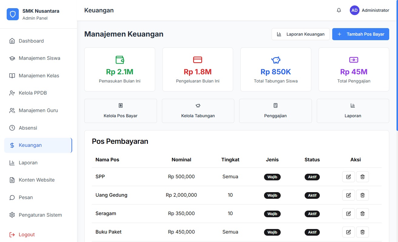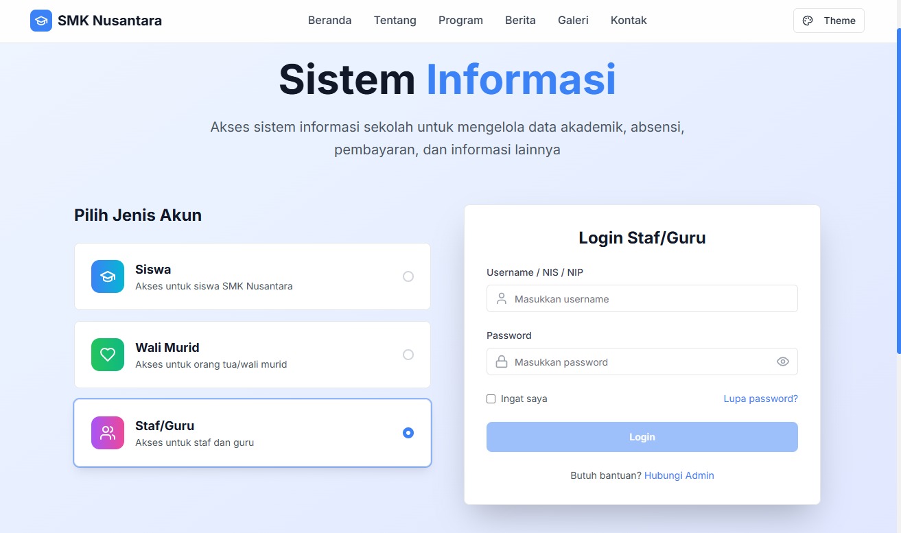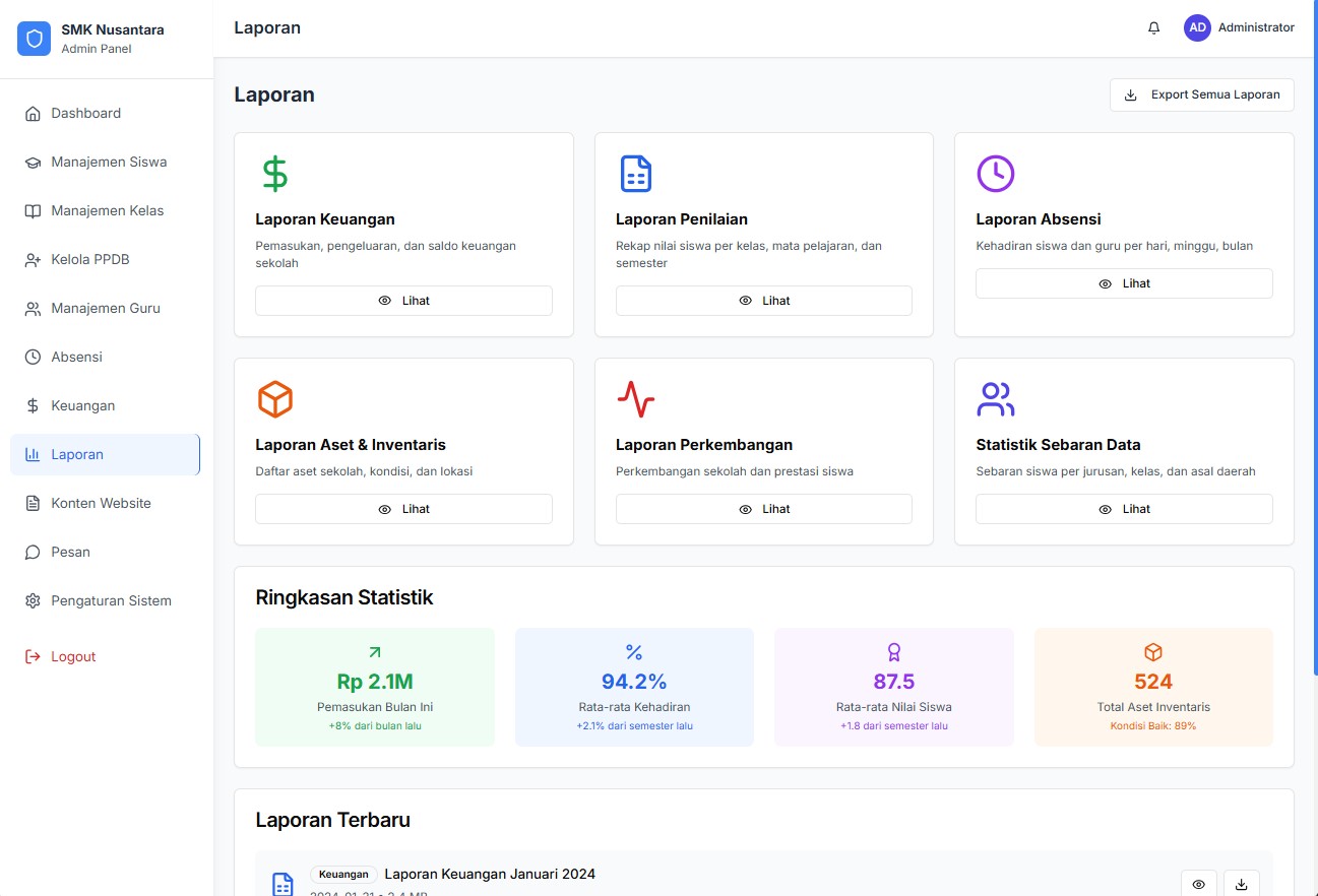 School Information System (SIS) modern berbasis web dan mobile yang memungkinkan manajemen sekolah untuk mengelola semua aspek operasional. Mulai dari data siswa, jadwal pelajaran, kehadiran, nilai, pembayaran, hingga komunikasi dengan orang tua. Sistem ini dilengkapi dashboard interaktif, laporan analitik real-time, serta modul untuk guru, admin, siswa, dan orang tua, membuat manajemen sekolah lebih efisien dan transparan.