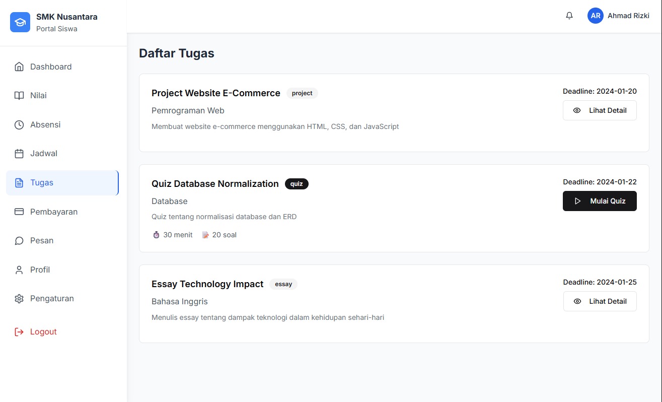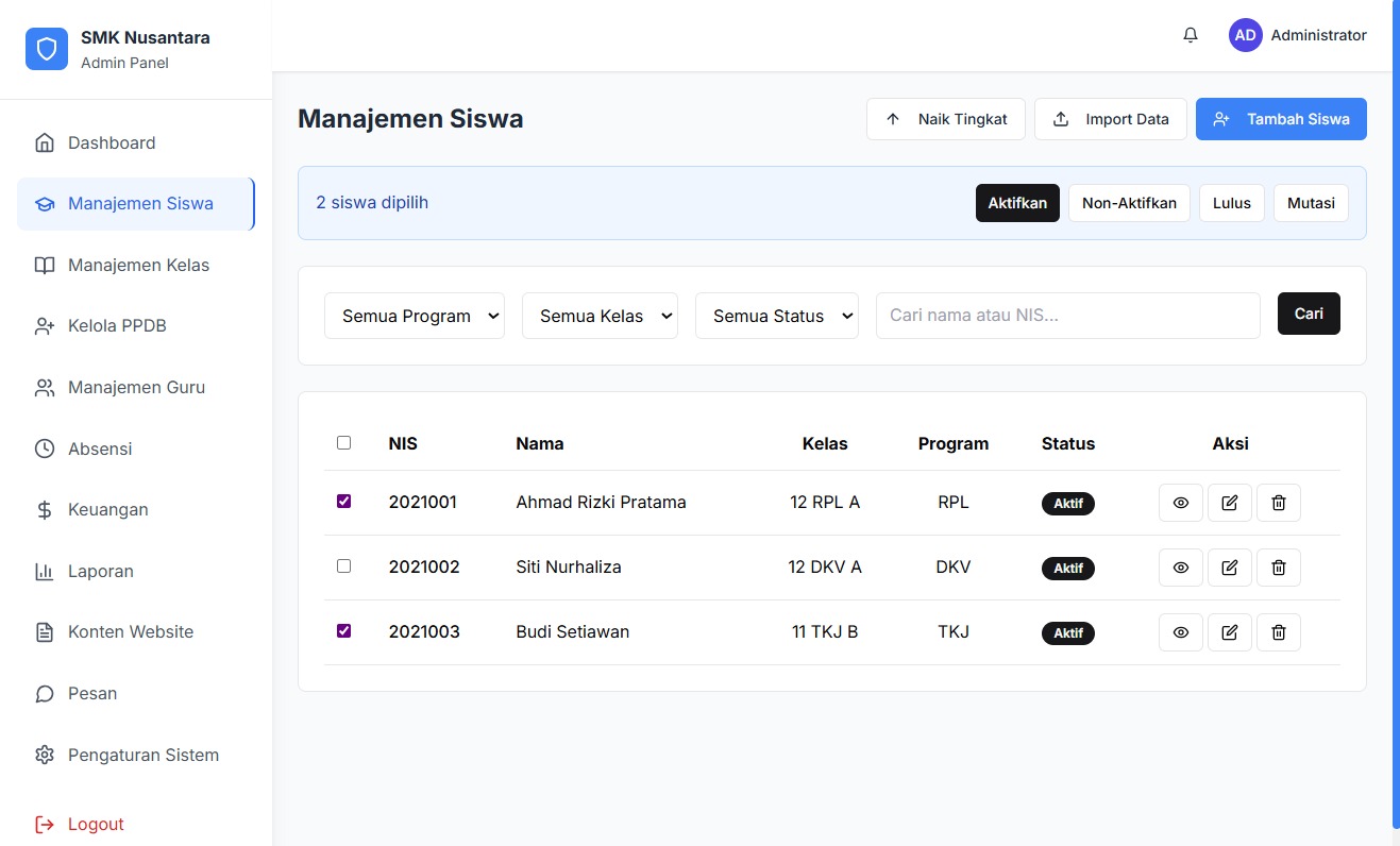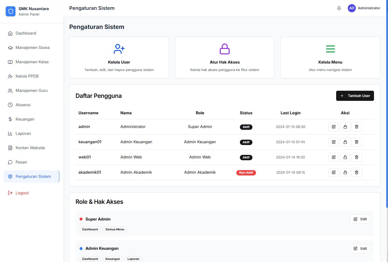 School Information System (SIS) modern berbasis web dan mobile yang memungkinkan manajemen sekolah untuk mengelola semua aspek operasional. Mulai dari data siswa, jadwal pelajaran, kehadiran, nilai, pembayaran, hingga komunikasi dengan orang tua. Sistem ini dilengkapi dashboard interaktif, laporan analitik real-time, serta modul untuk guru, admin, siswa, dan orang tua, membuat manajemen sekolah lebih efisien dan transparan.