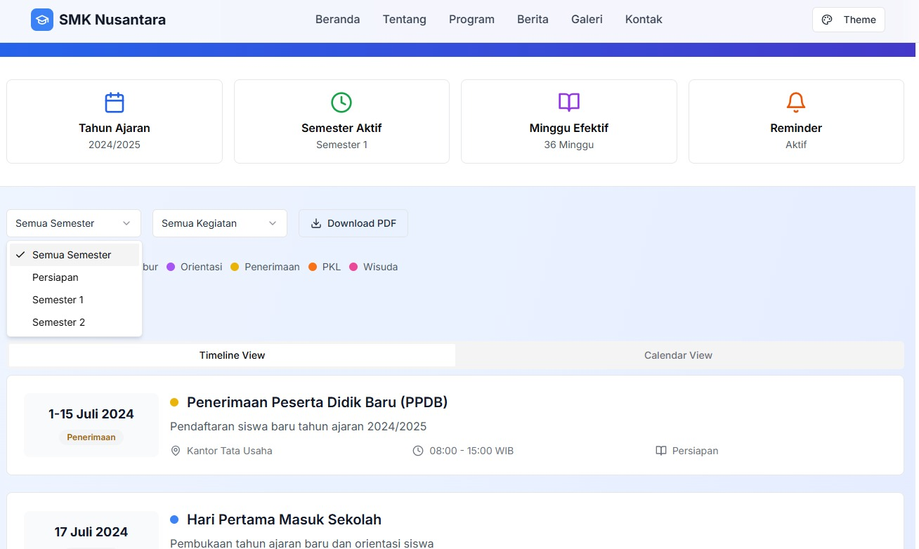 Sistem informasi sekolah lengkap untuk manajemen akademik, keuangan, kesiswaan, pengajaran, dan komunikasi dengan orang tua.
