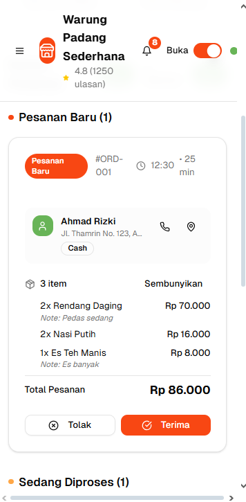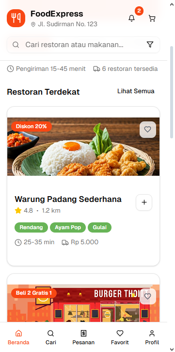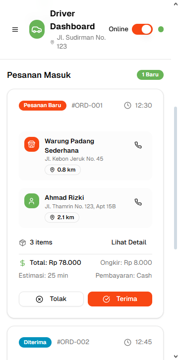 Aplikasi mobile untuk layanan delivery makanan yang menghubungkan restoran, driver, dan pelanggan dalam satu platform yang terintegrasi. Dilengkapi dengan GPS tracking, notifikasi real-time, dan sistem rating.