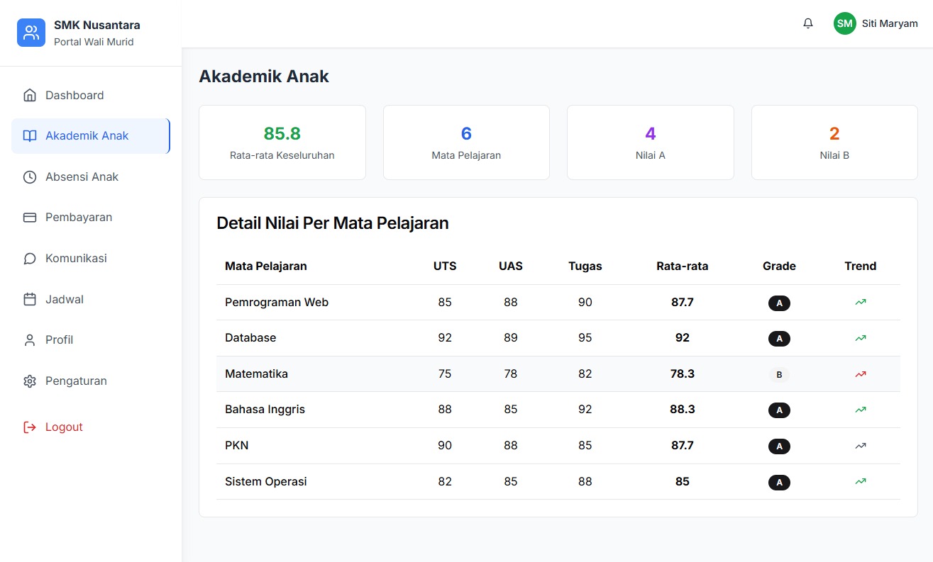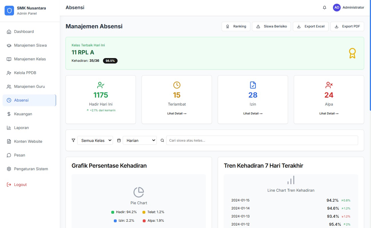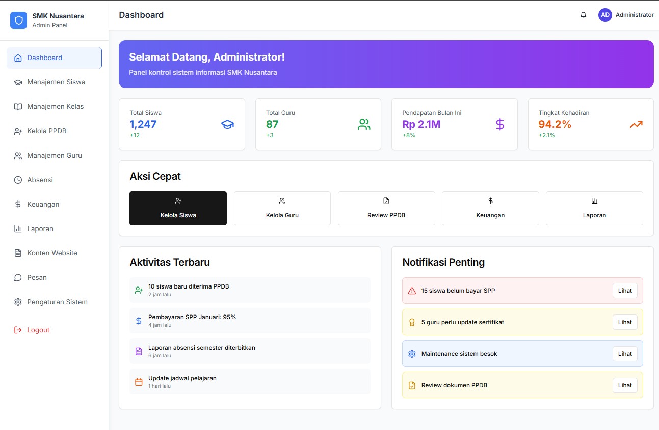 School Information System (SIS) modern berbasis web dan mobile yang memungkinkan manajemen sekolah untuk mengelola semua aspek operasional. Mulai dari data siswa, jadwal pelajaran, kehadiran, nilai, pembayaran, hingga komunikasi dengan orang tua. Sistem ini dilengkapi dashboard interaktif, laporan analitik real-time, serta modul untuk guru, admin, siswa, dan orang tua, membuat manajemen sekolah lebih efisien dan transparan.