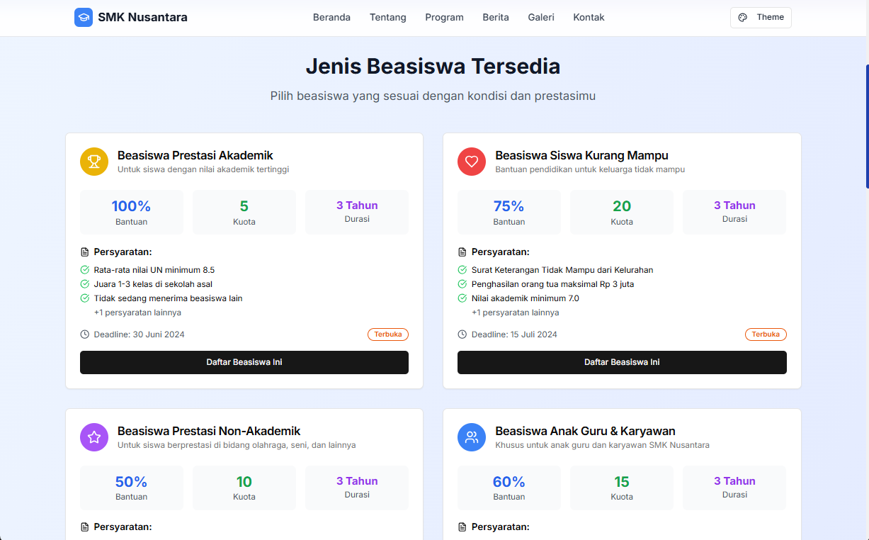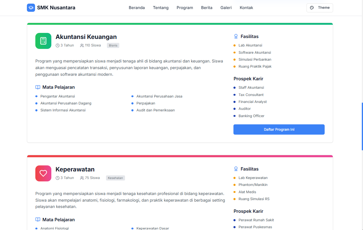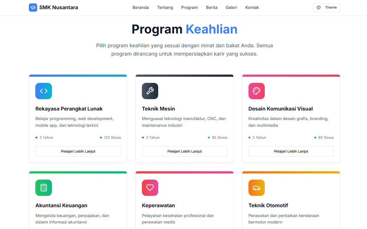Kami membantu sekolah untuk membangun website profesional. Menyediakan fitur manajemen konten untuk informasi akademik, berita sekolah, pengumuman, jadwal pelajaran, galeri foto & video, visi misi dan tujuan sekolah, menampilkan program kurikulum, kegiatan ekstrakurikuler dan banyak hal lainnya. Website responsif dan SEO-friendly, dengan desain modern dan user-friendly untuk meningkatkan komunikasi dan citra sekolah.